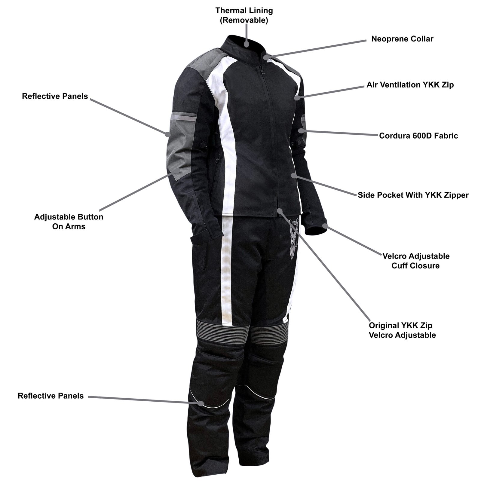 Ride protected and in style. Women’s biker suit with CE approved armor, durable 600D Cordura, and reflective panels.